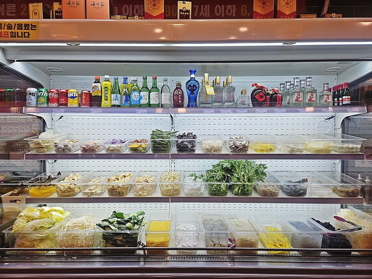 다양한 바이주를 비롯해서 맥주, 소주와 음료수가 있다. 그리고 훠궈나 마라탕에 넣어 먹을 수 있는 어묵, 채소와 면도 있지. 각자 알아서 먹을 만큼 가지고 오면 된다.
