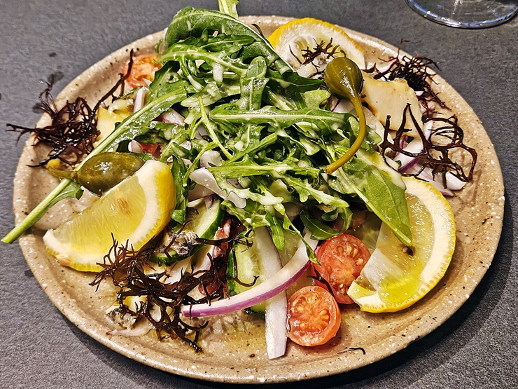 단감 모짜렐라 샐러드. 특이하게 단감을 메인으로 샐러드를 만들었는데 단맛이 좀 강하게 느껴져서 내 입에는 잘 맞지 않았다. 하몽과 단감을 함께 넣어 단짠단짠한 맛을 내세우려고 한 것 같은데, 단맛이 좀 튀는 느낌이었다. 내가 단맛을 좋아하지 않아서 그런 것일 수도 있다.