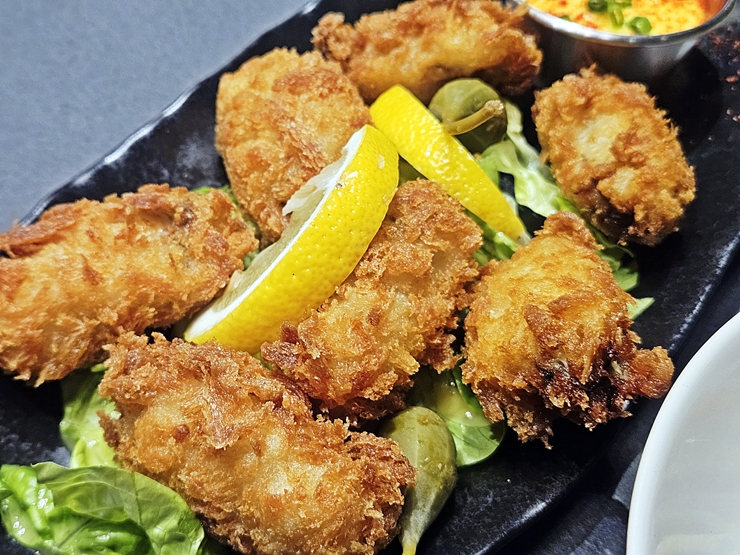 굴 튀김. 몇 년 전에 노로 바이러스에 심하게 감염된 후 생굴을 먹지 않고 있다. 하지만 굴찜이나 굴 튀김은 없어서 못 먹지. 굴은 튀기면 고소한 풍미가 더욱 깊어지는데 그 맛이 예술이다. 굴을 과하지 않게 잘 튀겼고 유자 소스를 통해 기름의 느끼한 맛을 잘 잡아준다. 이런 굴 튀김에는 와인보다 사케나 소주가 잘 어울리지만 이날은 와인을 즐겼지.