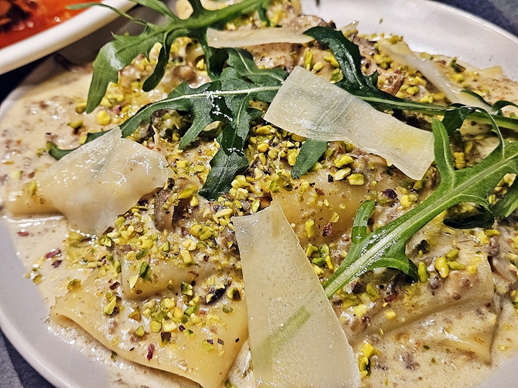 피스타치오 크림 파케리 파스타. 함께 간 지인들이 가장 맛있다고 극찬을 한 요리였다. 몇 년 전부터 피스타치오를 가지고 만든 요리가 많이 나오고 있다. 피스타치오 특유의 고소하면서 은은한 단맛이 크림의 맛에 묻히지 않고 잘 느껴진다. 두바이 초콜릿이 크게 유행하면서 피스타치오 단가가 많이 올랐다고 한다. 그런 피스타치오를 섭섭하지 않게 넣어 그 맛을 온전히 잘 느낄 수 있었다.