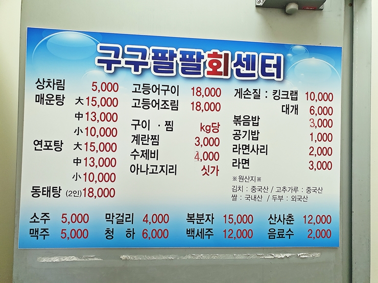 상차림 비용으로 1인당 5,000원을 받는다. 그 밖에 서더리 매운탕, 연포탕, 동태탕, 고등어구이, 고등어조림, 계란찜, 수제비와 볶음밥 등을 판매한다. 게 손질 비용은 따로 받는데 꽃게 같은 경우 손질이 간편하기 때문에 우리는 그냥 우리가 손질하기로 했다. 게를 먹을 때 빠질 수 없는 것이 바로 소주지. 게 손질 비용을 아껴서 소주 한 병 더 마시는 것이 좋다.