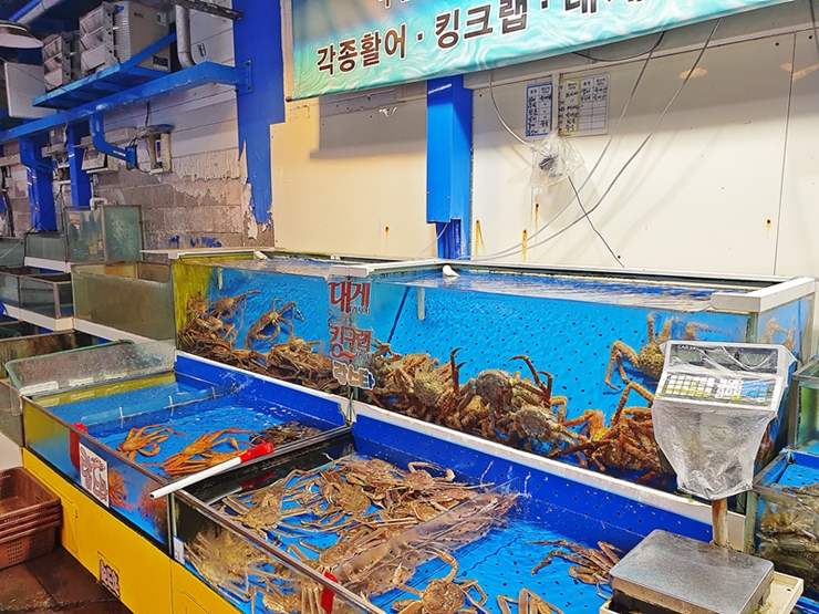 대게, 킹크랩, 꽃게, 홍게와 랍스터 등 다양한 갑각류가 있고 또 가리비, 백합과 키조개 등 다양한 패각류도 있었다. 나와 짝꿍은 게 중에서 꽃게를 가장 좋아한다. 꽃게가 워낙 대중적인 게이기 때문에 그 가치가 폄하 되는 면이 있긴 하지만 잘 굽거나 익힌 꽃게의 맛은 대게나 킹크랩 못지 않다.