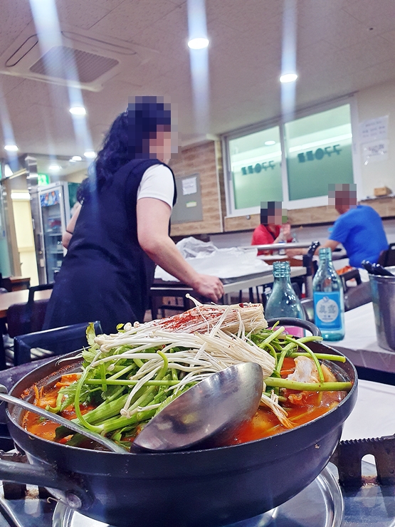 우리가 방문했을 때는 고객이 두 팀 정도 있었고, 가게 직원들이 막 식사를 끝내고 있었다. 3시라는 어중간한 시간에 가서 고객이 많이 없었는데, 저녁 시간이 되니 그래도 1/3 이상은 자리가 차는 것을 볼 수 있었다. 자리가 여유로웠기 때문에 바깥 풍경(?)을 바라보며 식사를 하려고 창가에 앉았다. 창가라고 해봐야 농수산물 도매시장이 보이는 것이 전부이지만 그래도 괜한 운치를 느끼고 싶었다.