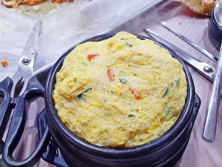 따로 주문한 계란찜. 조금은 뻑뻑하게 쪄진 계란찜이었지만 계란 함량이 높아서 고소한 맛을 잘 느낄 수 있었다. 난 계란을 굉장히 좋아하는 편이라서 고깃집이나 식당에 갈 때 계란찜을 꼭 주문하는 편이다. 계란찜에 게살을 올려 먹으니 고소한 맛과 눅진한 맛을 함께 느낄 수 있어 참 좋았다.