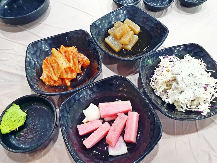 반찬. 와사비, 김치, 곤약, 샐러드와 피클이 나온다. 반찬은 모나지 않은 맛이었는데, 이 정도로 5,000원의 상차림 비용을 받는 것은 조금 과하다고 생각이 들었다. 그래도 뭐 기분 상하거나 아쉬움이 남을 정도는 아니었기 때문에 반찬을 안주 삼아 소주 한 병을 마셨다.