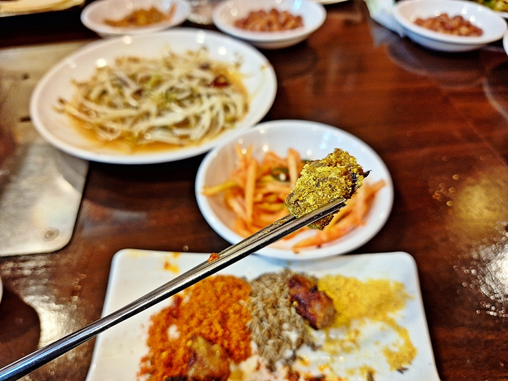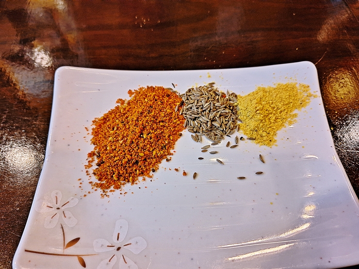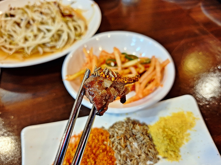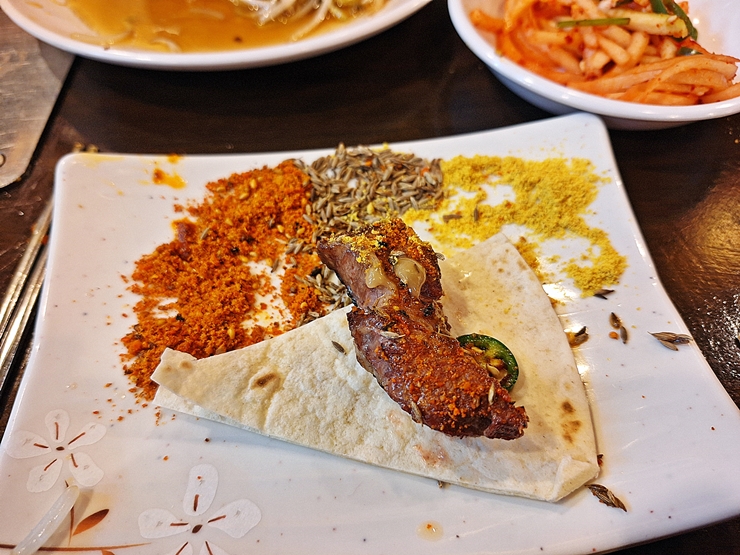 고춧가루, 쯔란과 카레 가루가 소스로 나온다. 매운 고춧가루도 있는데 그건 내 입에 너무 매워서 따로 뿌리지 않았다. 다 섞어 먹어도 되고 취향에 따라 따로 찍어 먹어도 된다.