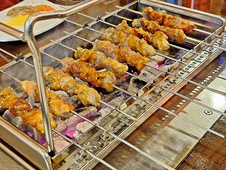 양꼬치도 주문했지. 양갈비는 화로에 놓고 구우면 되고, 양꼬치는 자동으로 돌아가는 기계가 있는 곳에 굽기로 했다. 한 곳에 다 굽고 싶지만 그럴 자리가 좀 부족했지. 양꼬치는 양념이 되어 나오는데 퀄리티가 좋다. 양꼬치가 처음 대중화 되었을 때는 참 질이 좋지 않은 자투리 고기를 사용했는데, 이제는 양꼬치가 굉장히 상향 평준화가 되어 퀄리티가 좋지 않으면 살아남을 수 없게 되었다.