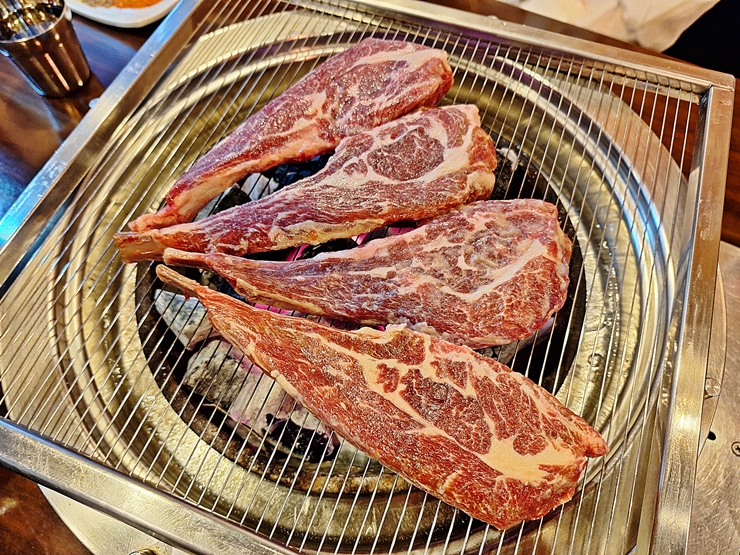 실로 아름다운 모습의 양갈비. 행복 양꼬치의 양갈비는 숄더 랙 부위를 사용한다. 프렌치 랙에 비해 부드럽진 않지만 적당한 탄성과 풍미가 깊은 것이 특징이다. 굽는 것은 내가 하기로 했지. 고기 굽는 것은 언제나 나의 몫이다. 고기 구울 때는 세상을 다 가진 것 같은 기분이 든다.