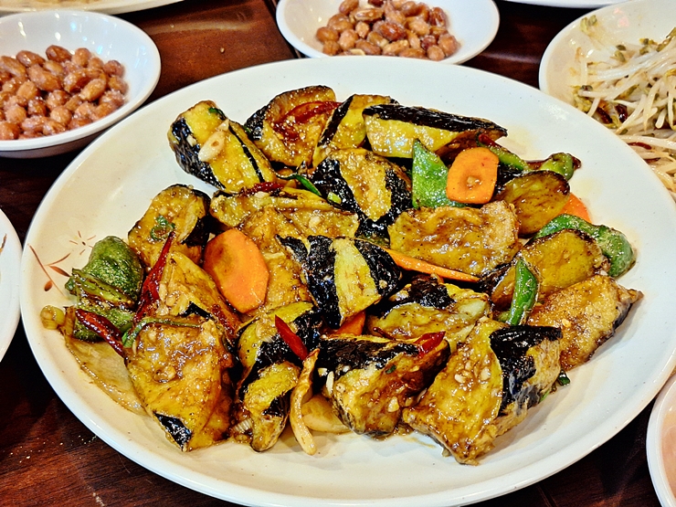가지 튀김. 가지에 전분을 살짝 묻힌 후 튀긴 것이다. 가지와 함께 피망, 당근과 고추를 함께 튀긴 후 짭짤하면서 달달한 소스로 볶았다. 겉은 쫄깃하면서 바삭하고 속은 굉장히 부드러운 것이 특징이다.