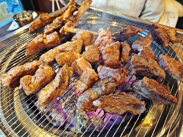 짠. 양꼬치도 다 구워졌다. 양꼬치는 기계가 알아서 구워주긴 하지만 가운데 부분은 화력이 강하고 바깥 부분은 화력이 약하기 때문에 중간 중간 자리를 바꾸며 굽는 것이 중요하다. 이런 것을 잘 하는 나는 참으로 멋진 나.
