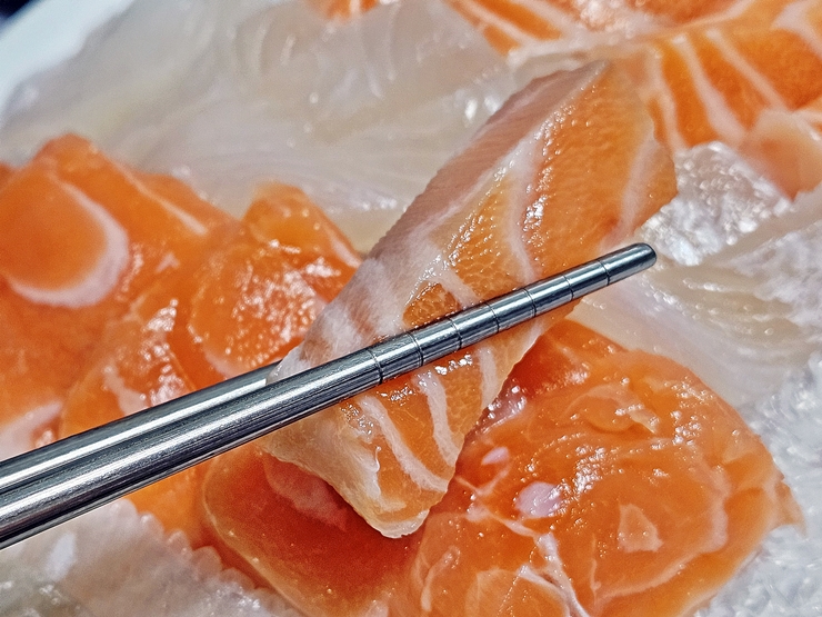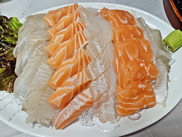 아름다운 광어와 연어의 모습. 이곳은 회를 굉장히 두툼하게 썰어서 제공하는 것이 특징이다. 동네 횟집이지만 활어 회가 나오는 것이 아니라 선어 회가 나온다. 잘 숙성된 선어 회는 감칠맛이 풍부하게 올라와서 맛이 좋다. 식감은 활어가 더 좋지만 맛은 선어가 더 좋지.
