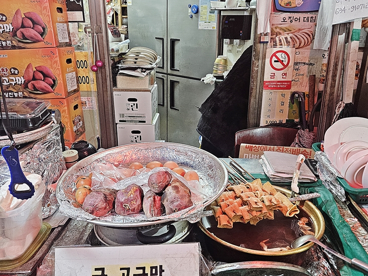 어묵도 하나 주문했다. 어묵을 주문하면 따뜻한 육수에 몇 번 담근 후 빼서 제공한다. 국물은 따로 주는데 국물 맛은 그냥 모두가 다 아는 딱 그런 맛이었다. 대전 중앙시장에서 포장마차의 향수를 느끼고 싶다면 한 번 가볼 것을 추천하는 곳이다.