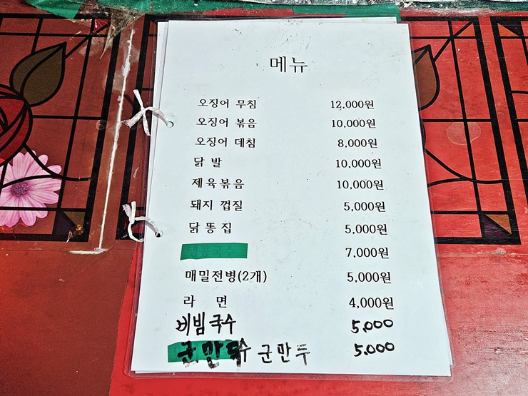 메뉴. 오징어 요리, 닭발, 제육볶음, 돼지 껍데기, 닭똥집, 메밀전병, 라면, 국수와 군만두를 판매하고 있다. 다른 것도 판매하고 있는데 귀찮아서 사진을 찍지 않았다. 딱 소주 한 병만 마시고 갈 생각이었기 때문에 돼지 껍데기와 어묵 하나를 주문했다.