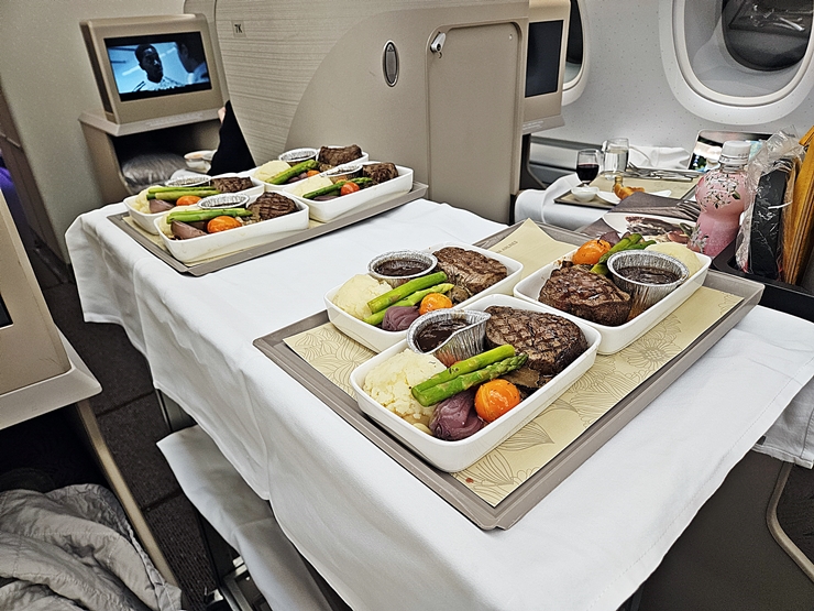 메인 요리가 담겨진 카트가 다가온다. 메인 요리는 블랙 트러플 안심 스테이크, 광어 스테이크와 버섯 리조또 또는 고추장 닭 불고기 중에 선택할 수 있다. 나는 단백질을 잊지 않고 꾸준히 잘 섭취하는 멋진 남자이기 때문에 블랙 트러플 안심 스테이크를 선택했다. 이제 나 정도 나이가 되면 단백질을 꼭 챙겨 먹어야 한다.