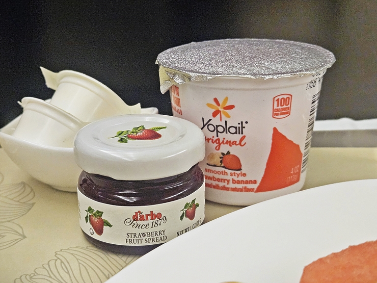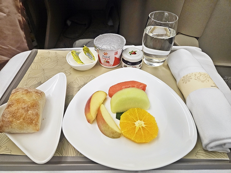 귀국 비행기에서는 식사를 한 후 한 숨 자고 일어났다. 아무래도 출장 피로가 쌓여서 나도 모르게 잠든 것 같다. 일어나서 정신을 차리니 어느덧 또 식사 시간이 되었다. 가장 먼저 나온 것은 빵, 요거트, 잼과 여러 과일들이다.