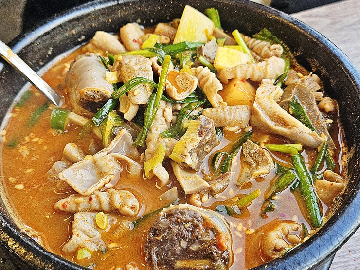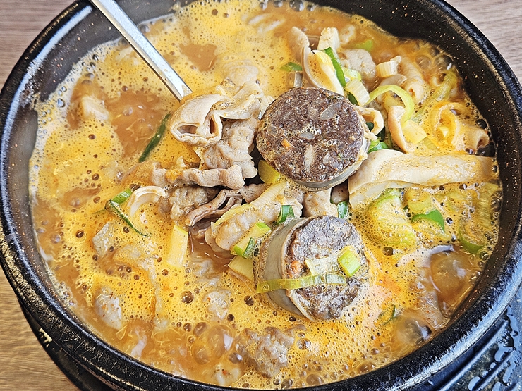 아름다운 모습의 순댓국. 국물 자체에 양념이 들어간 상태로 나온다. 뚝배기가 굉장히 뜨거운데 먹음직스러운 냄새가 코 끝을 자극한다. 이런 냄새를 맡게 되면 나도 모르게 군침이 돌기 마련이지.