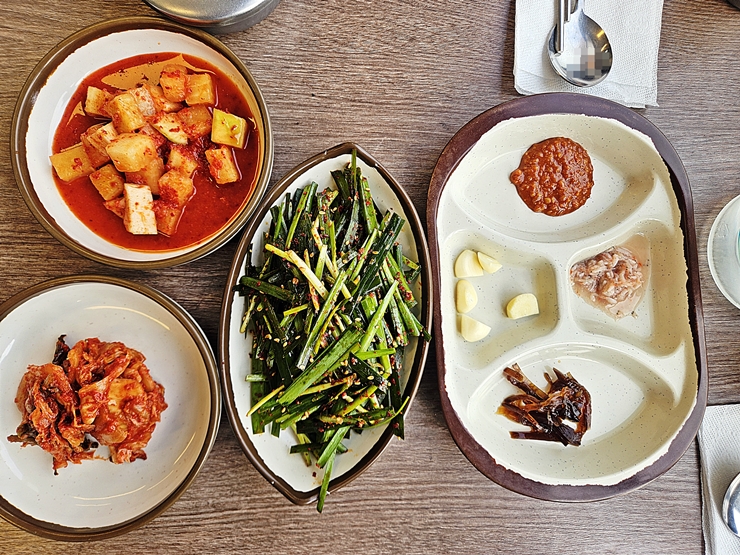반찬. 깍두기, 김치, 부추 무침, 쌈장, 마늘, 새우젓과 파김치가 나온다. 파 김치가 굉장히 숙성이 되어 내 입에는 잘 맞지 않았다. 이런 신맛 가득한 김치는 내가 먹기 좀 어렵지.
