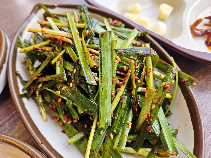 굉장히 맛이 좋았던 부추 무침. 고춧가루를 사용해서 무쳤는데 기름도 살짝 넣은 것인지 은은하게 고소하고 살짝 매콤한 맛이 일품이었다. 안 그래도 부추를 좋아하는 내가 이렇게 맛있는 부추 무침을 만나면 많이 먹을 수 밖에 없지. 그래서 한 번 리필했다.