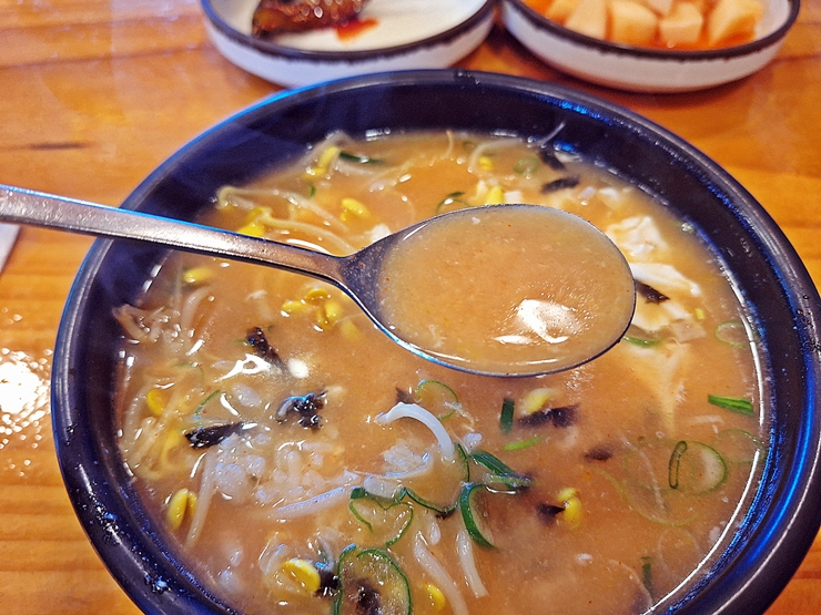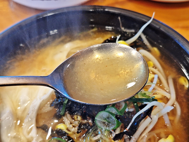 먼저 국물만 떠서 먹어보기로 했다. 국물에서 멸치의 맛이 상당히 강하게 느껴지는데, 전혀 비리지 않고 개운하다. 콩나물과 같이 끓여서 뒷맛에서 살짝 개운한 단맛도 함께 느껴진다. 이런 국물을 마시면 해장은 한 방이지. 술을 마시지 않았음에도 속이 편안해지는 기분이다.