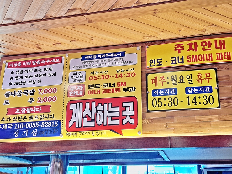 메뉴는 콩나물국밥과 모주만 있다. 이렇게 메뉴가 간단한 곳은 괜한 믿음이 생기기 마련이다. 모주를 제외한 주류는 전혀 판매를 하지 않는데, 아주 좋은 판매 전략이다. 콩나물국밥과 소주는 환상의 조합이기 때문에, 소주를 판매하게 되면 회전율이 떨어지기 때문이다.