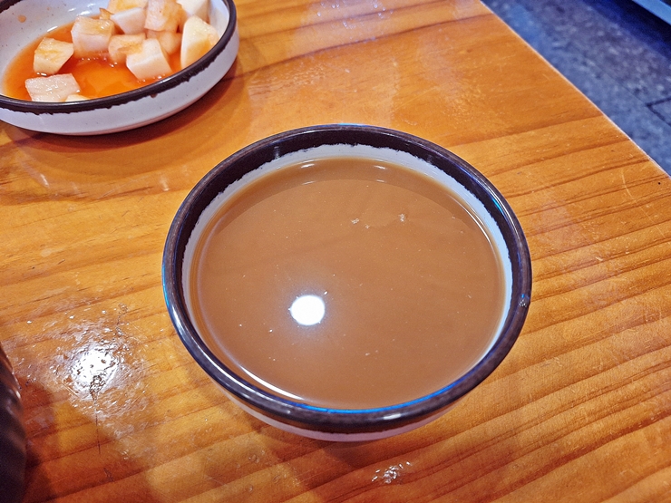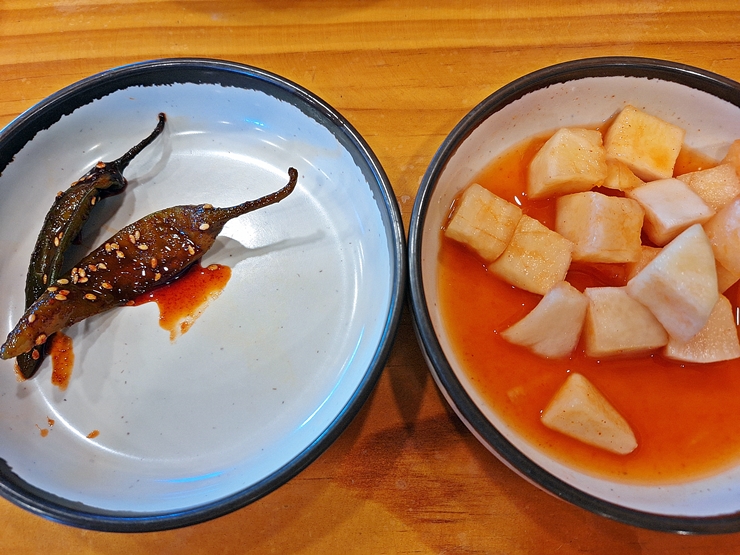 반찬은 고추 장아찌와 깍두기가 나온다. 처음 반찬을 제공할 때는 소량만 제공하는데, 추후에 반찬이 더 필요할 경우는 셀프 바를 이용해서 알맞게 가져다 먹으면 된다.