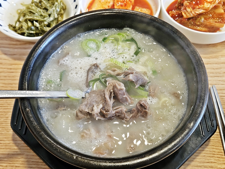 곰탕이라고 부르는 것이 민망하지 않을 정도로 국물이 굉장히 진한 것이 특징이다. 따로 간을 하지 않아도 깊은 풍미를 느낄 수 있다. 국밥 안에는 소 머리의 다양한 부위가 들어간다.
