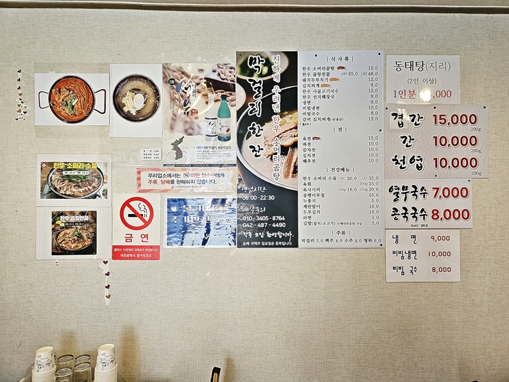 메뉴. 소머리국밥. 곱창전골, 두루치기, 김치찌개, 선지 해장국, 냉면, 비빔국수, 한우 육회와 육사시미 등을 판매하고 있다. 우린 소머리국밥과 육사시미를 주문했다. 낮에 먹는 육사시미는 각별하기 그지 없지.