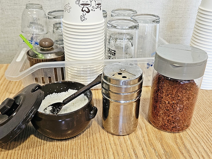 국밥에 넣어 먹을 소금, 후추와 고춧가루도 있다. 소주와 맥주 잔을 보니 술 한 잔 하고 싶었지만, 운전을 해야 하기도 했고 술을 줄이고 있는 시기였기 때문에 따로 술은 마시지 않았다.