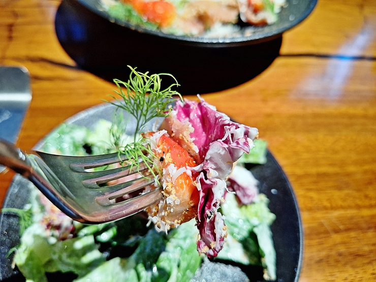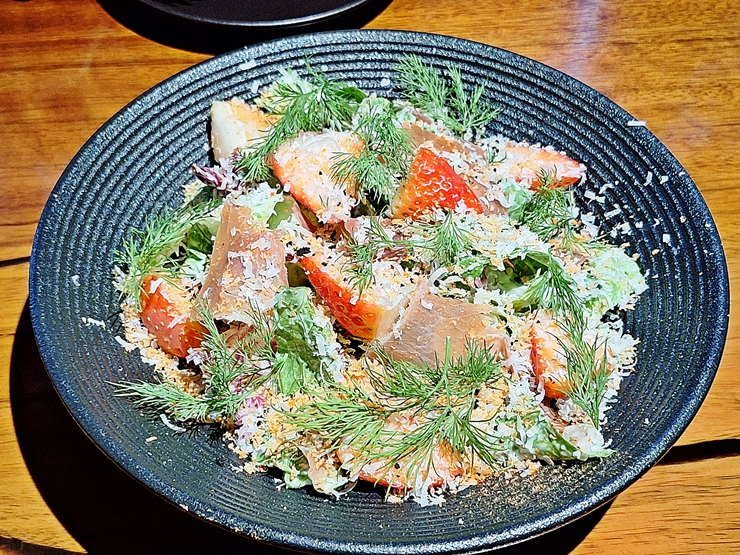 시저 샐러드의 묵직하면서 느끼한 맛을 허브와 딸기가 잘 잡아준다. 거기에 하몽의 기름짐과 고소한 맛이 전체적으로 맛을 강조해준다. 이런 샐러드라면 언제나 즐겁게 먹을 수 있다.