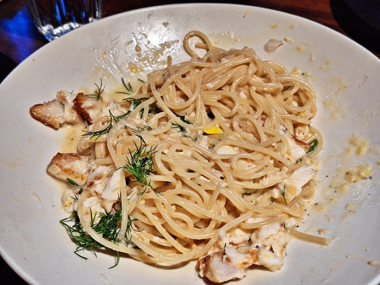가자미 레몬 딜 스파게티니. 큼직한 가자미 한 쪽이 다소곳하게 올라가 있다. 직원이 가자미를 해체한 후 파스타에 잘 비벼주는데 잠시 기다렸다가 그 후에 먹으면 된다.