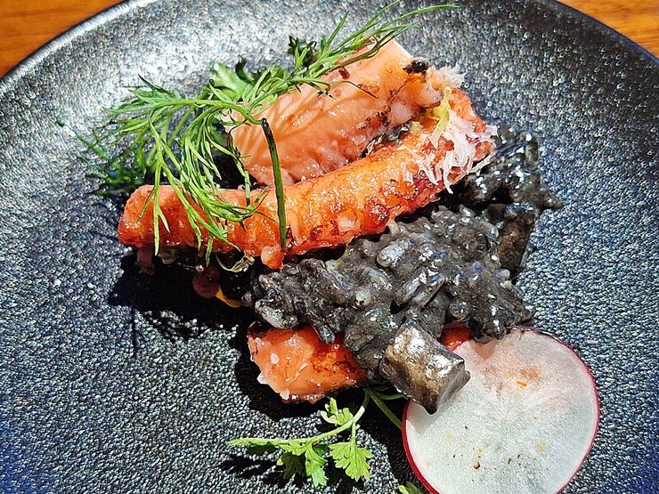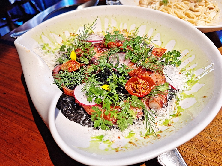 문어 스테이크 먹물 리조또. 오징어 먹물을 사용한리조또에 선 드라이 토마토, 문어와 각종 허브를 위에 올린 메뉴다. 오징어 먹물은 특유의 짭짤함과 감칠맛이 있는데, 이 맛이 리조또나 파스타에 굉장히 잘 어울린다.