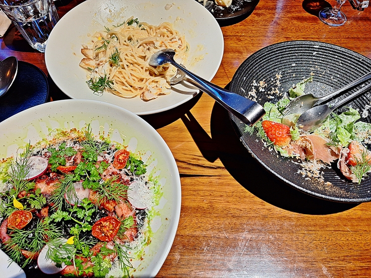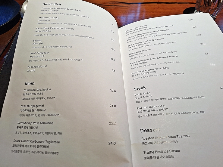 메뉴. 샐러드, 카르파치오, 세비체, 파스타, 리조또, 스테이크와 디저드 등 다양한 이탈리안 요리가 있다. 짝꿍은 하몽 딸기 시저 샐러드와 문어 스테이크 먹물 리조또를 고르고, 나는 가자미 레몬 딜 스파게티니를 골랐다.