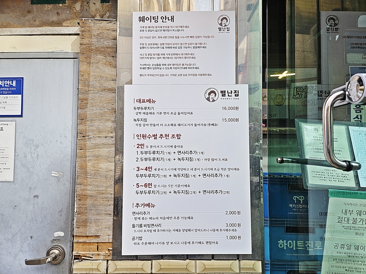 메뉴. 메인으로 두부 두루치기와 녹두지짐을 판매하고 있고 추가 메뉴로 면 사리, 들기름 비빔 사리와 밥을 판매하고 있다. 메뉴가 참 간소한데 이렇게 오랜 역사를 지니는 것이 놀랍다.