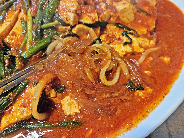 두부 두루치기 안에 당면도 들어있다. 혼자 간 거라서 면 사리까지 먹으면 양이 많을 것 같았는데, 당면이 들어 있으니 주문을 하지 않았던 것이 올바른 선택이었다. 양념은 매콤하면서 은은한 단맛이 느껴지는데 이 맛을 당면이 온전히 흡수해서 맛이 좋았다.