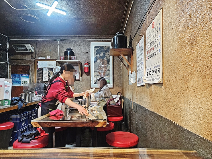 식당 내부는 고즈넉하고 레트로한 분위기를 느낄 수 있다. 요즘 유행하는 인테리어와 전혀 반대 되는 모습이지만, 이런 곳에 오면 또 이런 인테리어가 굉장히 정겹고 좋지. 내가 방문했을 때는 두 자리를 제외한 나머지가 다 만석이어서 다른 쪽 사진은 찍지 못했다.