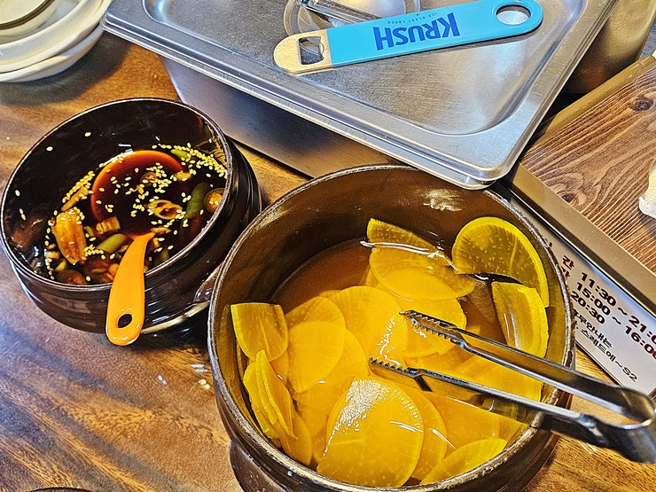 유이한 반찬인 단무지와 간장. 간장은 고추와 마늘 등을 넣었다. 테이블 위에 간장과 단무지가 놓여 있어서 알맞게 덜어 먹으면 된다. 많이 담을 경우 음식물 쓰레기가 생기기 때문에 적당히 먹도록 하자. 역시 환경을 생각하는 멋진 나.