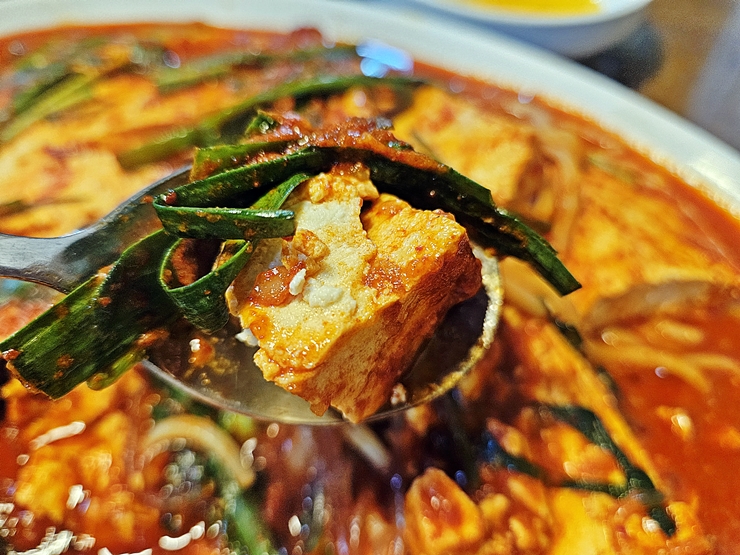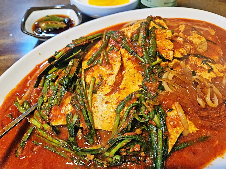 아름다운 모습의 두부 두루치기. 이런 두루치기에는 소주 한 잔 마셔야 하지만 최대한 술을 마시지 않기 위해서 꾹 참았다. 술 없이 이런 메뉴를 먹는 것은 참으로 어렵고 슬픈 일이 아닐 수 없다. 두부 두루치기에는 내가 좋아하는 부추도 한가득 들어간다.
