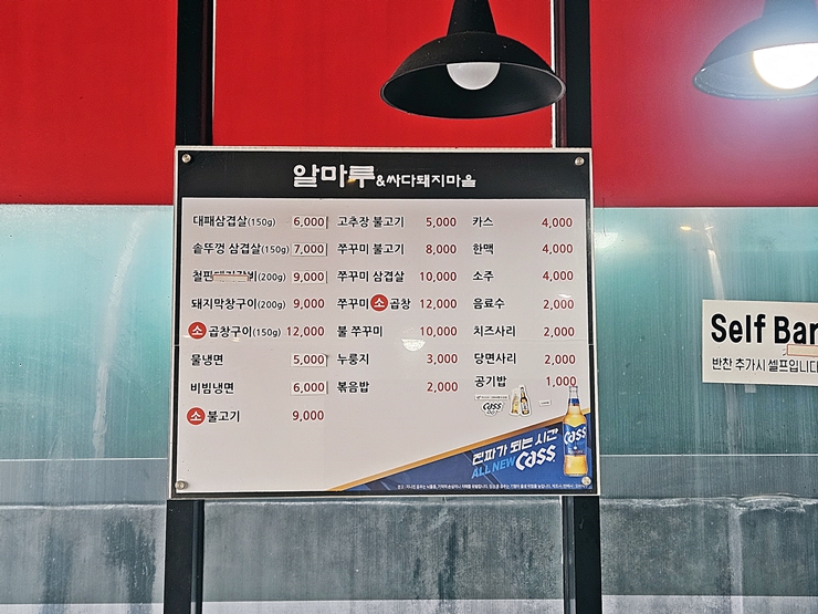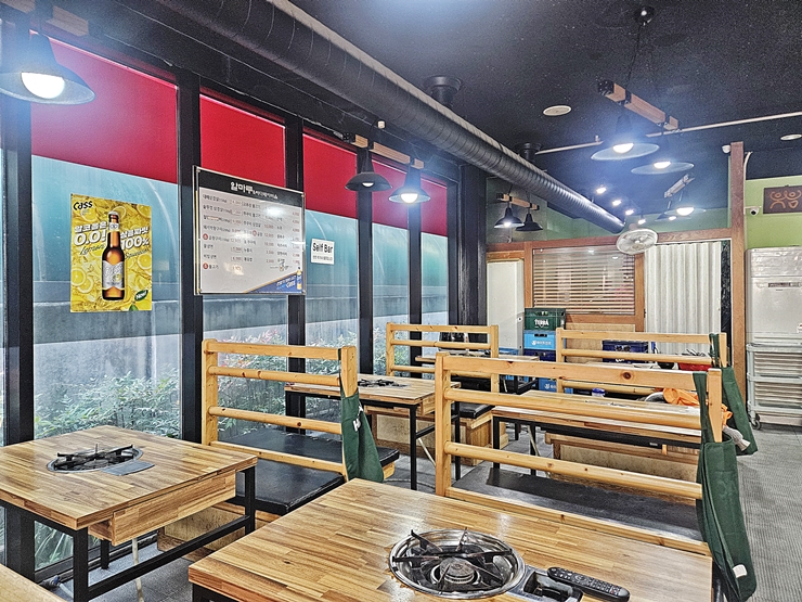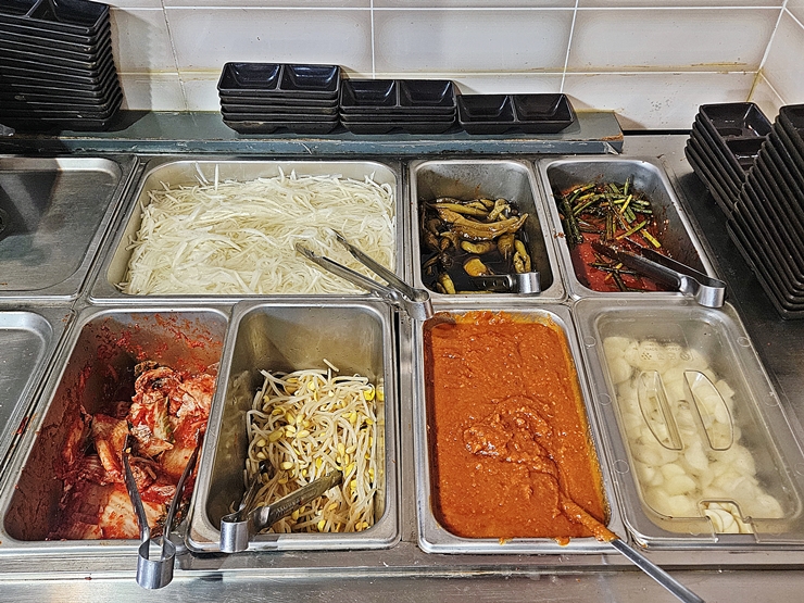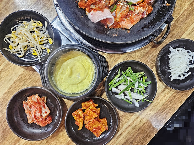 반찬은 처음에는 바로 제공을 하고, 그 이후부터는 부족한 반찬을 셀프 리필 바를 이용해서 가져다 먹을 수 있다. 콩나물, 김치, 쌈장과 장아찌 등 고깃집에서 흔히 볼 수 있는 것들이 준비 되어 있다.