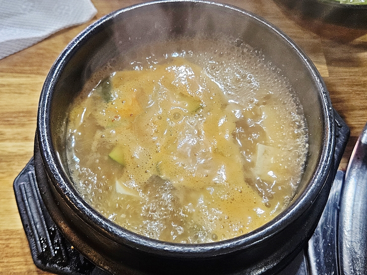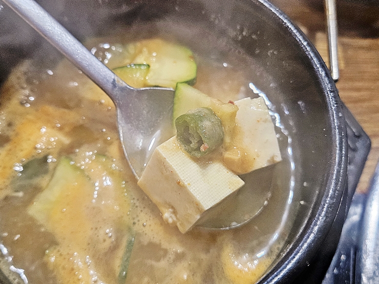 쭈삼이 익고 있을 때 살포시 내려놓고 간 된장찌개. 전혀 기대도 하지 않았는데 이런 된장찌개를 또 받다니. 참으로 행복한 일이 아닐 수 없다. 된장찌개에 호박, 고추, 양파와 두부만 들어간 소박한 스타일이다.