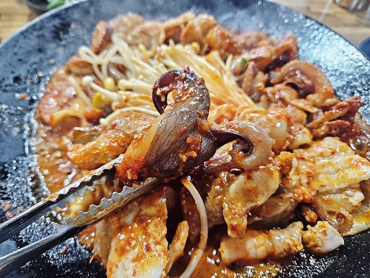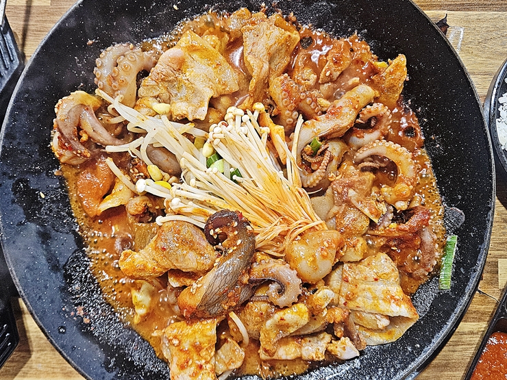 아름다운 모습의 쭈삼. 이 가격이라면 당연히 고기와 주꾸미는 냉동이지. 이런 가격에서 냉장 고기나 냉장 주꾸미를 바라는 것은 크나큰 욕심이 아닐 수 없다. 나와 일행 모두 매운 것을 잘 먹지 못하기 때문에 최대한 맵지 않게 부탁을 했다. 그래도 매워 보이는 것은 어쩔 수 없구나. 쭈삼 위에는 팽이 버섯과 파도 들어간다.