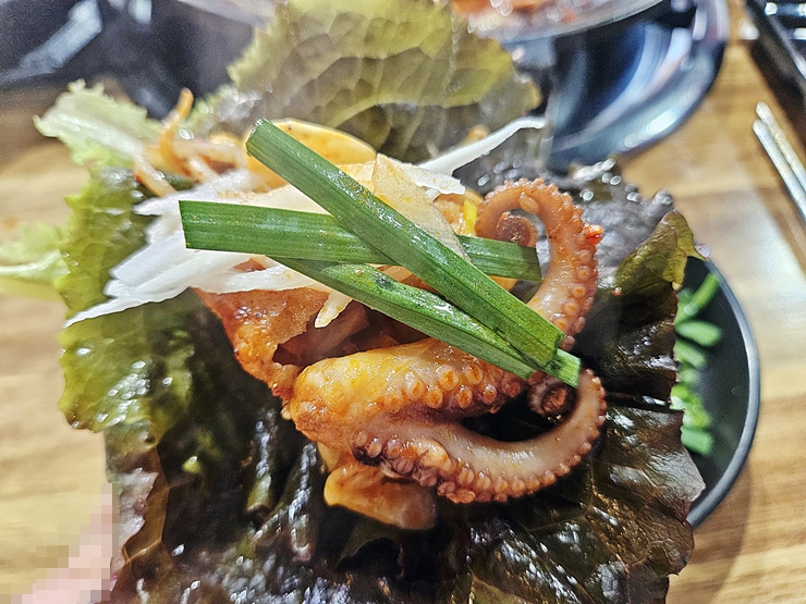 상추 위에 돼지고기와 주꾸미를 올린 후 쌈장을 넣고 그 위에 마늘과 파를 올려 먹었다. 양념이 내 입에는 살짝 맵게 느껴지긴 하지만 일반 사람들이라면 전혀 맵지 않을 맛이다. 은은한 감칠맛이 느껴지고, 이 감칠맛이 돼지고기와 주꾸미와 조화를 잘 이룬다. 덕분에 저렴한 가격으로 쭈삼을 즐겼지. 엄청난 맛집이라고 할 수는 없지만 저렴한 가격대에 가볍게 쭈삼을 먹을 수 있었다. 가벼운 마음으로 쭈삼을 먹고 싶다면 한 번 가볼 것을 추천하는 곳이다.