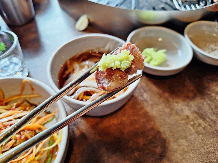 수정방 한 잔 마신 후 늑간살에 와사비를 올려서도 먹었지. 와사비의 톡 쏘는 맛이 돼지고기의 느끼함을 잘 잡아준다. 좋은 술과 좋은 고기가 만나니 과음이 보이는구나.