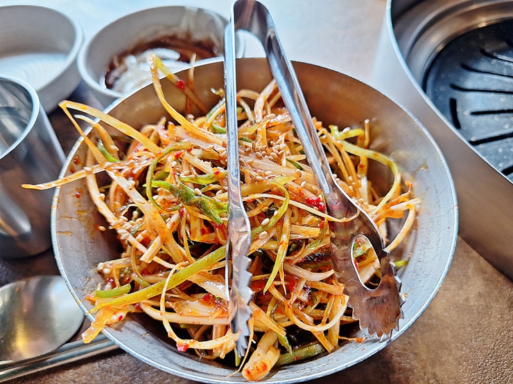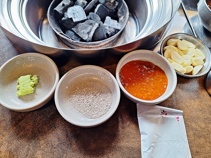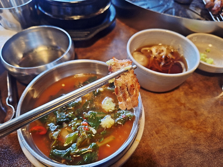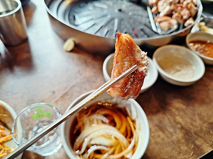 잘 구워진 늑간살에 소금을 콕 찍어서 먹었다. 항정살만큼 통통 튀는 식감은 없지만 나름의 탄력이 있고 진한 맛이 느껴진다. 이 맛은 술을 부르는 맛이다.
