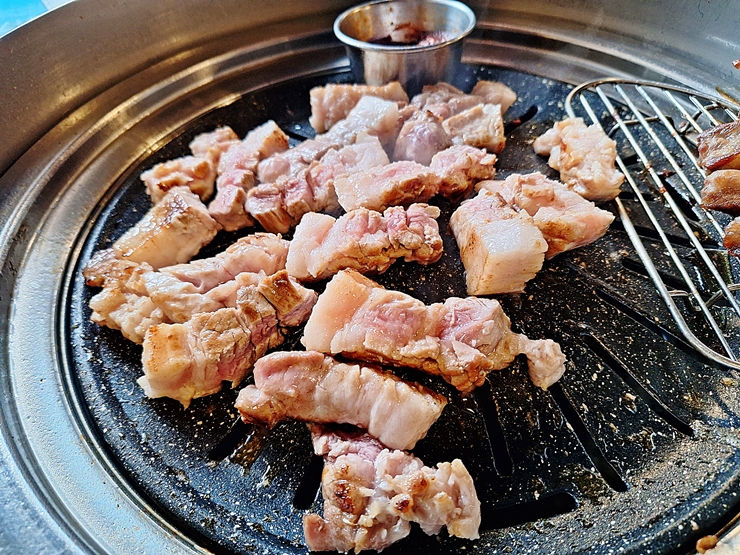 고기 집도는 언제나 나의 몫이지. 삼겹살에 비해 지방이 적은 늑간살 먼저 굽기로 했다. 지방이 적은 부위부터 먹는 것이 올바르자 바람직한 순서라 할 수 있다.