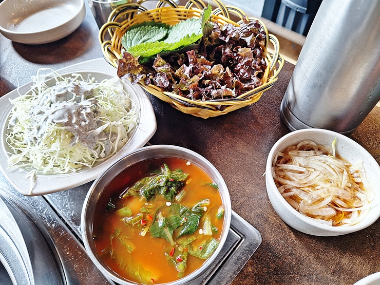 기본 반찬. 상추, 깻잎, 샐러드, 양파 절임, 와사비, 소금, 쌈장, 마늘과 파 무침이 나온다. 육갑식당의 파무침은 상당히 맛이 좋기 때문에 한 번 리필을 해서 또 먹었지.