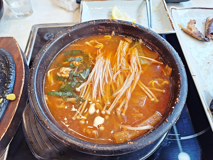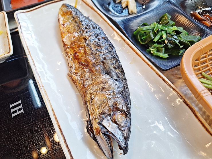 고등어는 한 마리가 아닌 반 마리가 나온다. 촉촉하게 잘 구워진 고등어는 그냥 먹어도 맛있고 소주와 함께 먹어도 맛있지. 회를 먹을 때 소주를 마시지 않는 것은 예의가 아니기 때문에 소주도 한 병 주문했다. 술을 줄이고 있는 시기이긴 하지만, 짝꿍이 먼저 마시자고 하는 것을 거절할 수는 없지.
