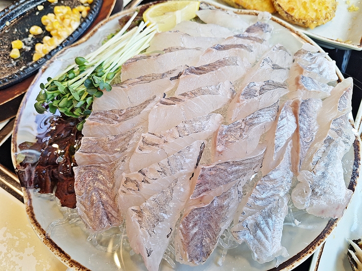 활어 회이기 때문에 선어 회만큼의 감칠맛은 느껴지지 않는다. 하지만 선어 회보다 식감이 좀 더 좋고 탱글한 느낌이 들지. 가볍게 먹기에는 전혀 부족하지 않은 회다.