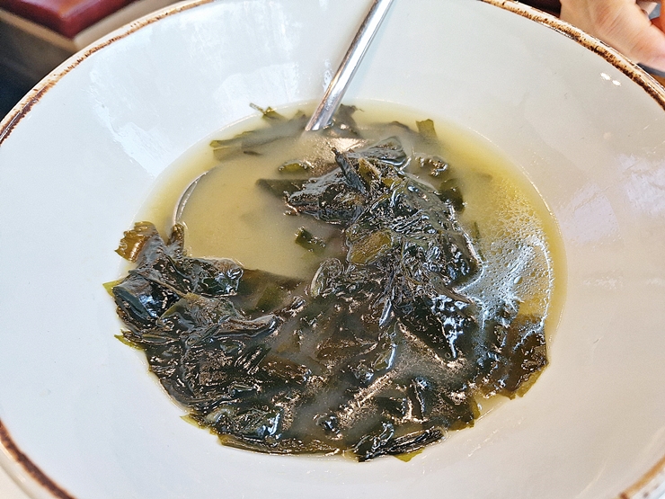 기본으로 나오는 미역국. 미역 외에 다른 것이 들어가지 않았지만 미역을 아끼지 않아서 상당한 감칠맛이 난다. 미역국이 부족할 경우 셀프 바를 이용해서 리필을 하면 된다.