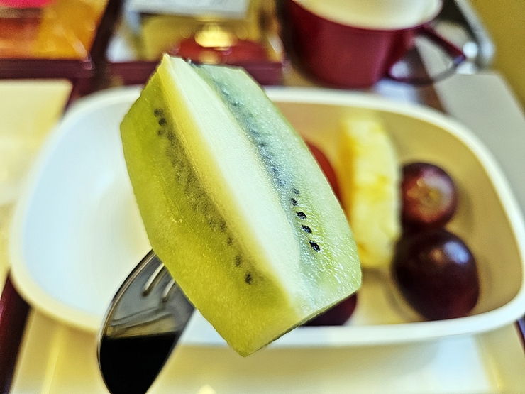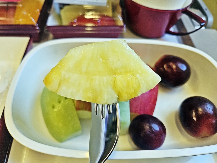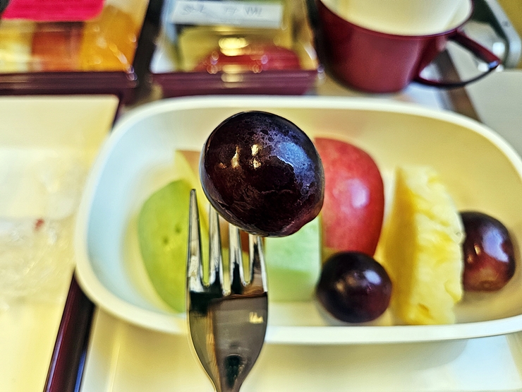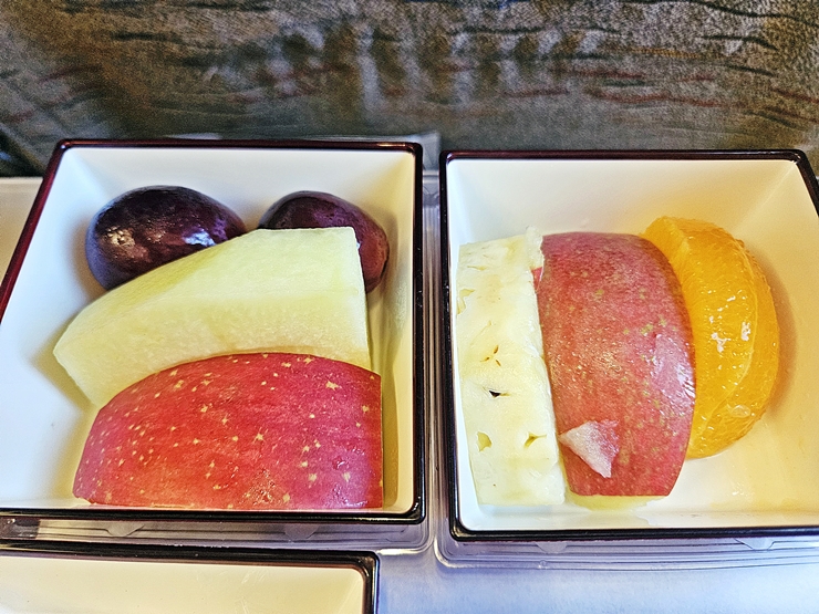 과일식은 세 접시에 나눠 나오는데 한 접시는 일반식이나 다른 특별 기내식에 들어가는 것과 동일한 구성인 것 같다. 가장 큰 접시에는 키위, 사과, 멜론, 파인애플과 포도가 들어있다.