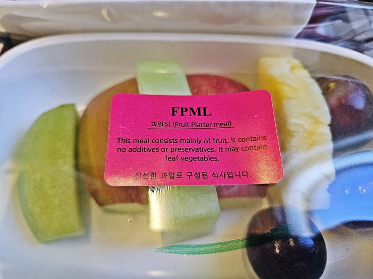 특별 기내식을 신청할 경우 일반 기내식에 비해 빨리 받을 수 있다. 승무원이 먼저 특별 기내식을 신청했는지 확인하고 그 후에 바로 제공한다. 과일식에는 "신선한 과일로 구성된 식사입니다." 문구와 함께 영어로 어쩌고 저쩌고 적혀있다. 아마도 한국어와 동일한 내용일 것이다. 역시 영어영문학을 전공한 멋진 나.
